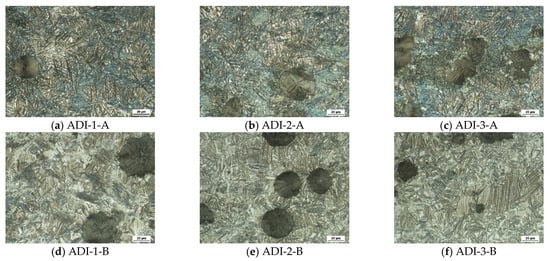 As noted earlier, the microstructure of austempered ductile iron consisted of spheroidal graphite, which was dispersed in a matrix of high carbon austenite and ferrite needles called ausferrite. The final morphology of the ausferrite structure was determined according to the austenitization and the austempering temperature. Figure 15a–f illustrates the resulting microstructures of the dilatometry samples, which were austenitized at 900 °C and then austempered at two different temperatures of 275 °C and 375 °C. The main features of the microstructures could be described as follows: