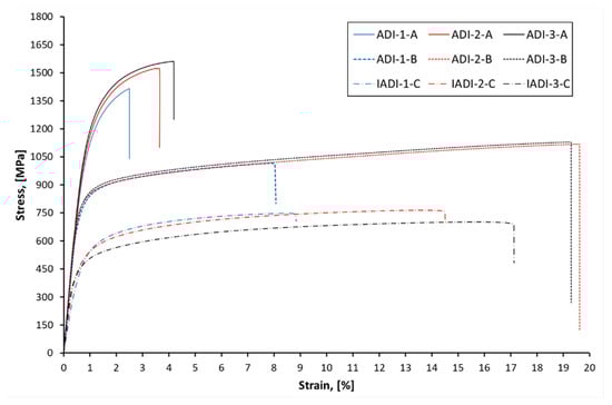 Engineering stress—strain curves obtained during tensile testing of the investigated ADI alloys microalloyed with three different niobium contents.