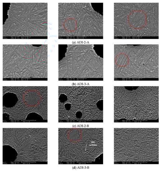 To confirm the decisive role of the morphology of the ausferrite on the tensile behavior of the Nb microalloyed ADI samples, SEM micrographs were obtained (see Figure 18). It was mentioned earlier that Nb addition resulted in refining the graphite structure and increasing the number of eutectic cells. This would explain the short-length ausferrite structure and the fine austenite blocks that appeared in the Nb microalloyed ADI samples. Moreover, the inhomogeneity of C-content in the matrix resulted in the formation of coarse ausferrite structure and fine sheaves of ausferrite (marked by a red circle).