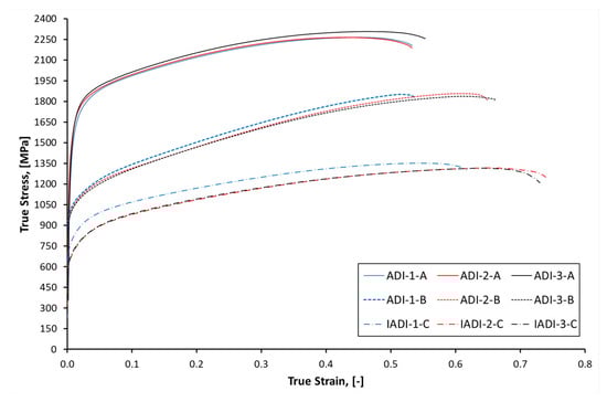 True stress—strain curves obtained during compression of the investigated ADI alloys microalloyed with three different niobium contents.