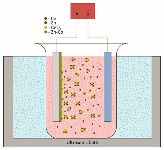Zetasizer NS (Malvern, UK) was used to determine zeta (ζ) potential (surface charge) of ceria particles, based on measured electrophoretic mobility of the particles. The particle size distribution (PSD) was determined by dynamic light scattering method using the same instrument. Prior to the measurements, the samples were subjected to 20 min ultrasound treatment. Deposition time was calculated to obtain 7 µm thick coatings. The 200 mL plating cell was placed in the center of the ultrasonic bath, schematically presented in Figure 1. Temperature of the plating solution was monitored, controlled, and kept constant during deposition at 24 ± 1 °C. Low-carbon steel (AISI-1010, 8 cm2) was used as cathode and pure zinc as anode. Before electrodeposition the cathode was polished to a smooth surface with different grits of emery paper (600–2000), degreased in a saturated solution of sodium hydroxide in ethanol and etched in 10% HCl solution. The distilled water wash was applied after every step. The anode was activated by dipping in 10% HCl solution followed by water wash.