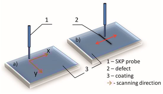 Schematic presentation of SKP measurements: (a) surface scanning on unbounded coatings and (b) line scanning over artificial defect.