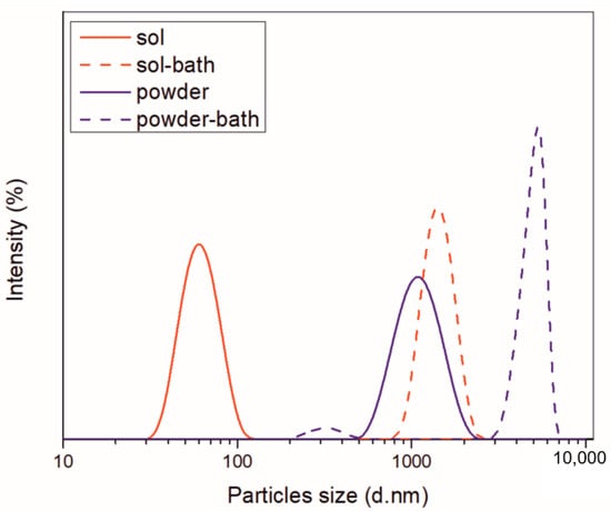 The stability of aqueous ceria sol and ceria powder particles dispersed in water was studied in terms of zeta potential (ξ) and particle size distribution (PSD). Since it is important to get information on the stability of the overall plating solutions containing CeO2 particles, the study was extended to their stability when incorporated in the electrolytic bath with other constituents. The PSD of examined solutions is presented in Figure 3.
