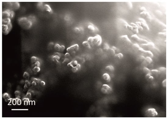 In the case of ceria powder in aqueous solution, although composed of nanometric primary units, as confirmed by SEM analysis (Figure 4), it was agglomerated. The use of ultrasound agitation failed at effectively de-agglomerating the particle clusters. The size of particle diameters was in the 531–1990 nm range, with Zav = 1316 nm. When adding the ceria powder into the electrolyte, the high ionic strength of the bath (260 mS cm−1) caused a decrease in ξ-values (from initial 49 to near 0 mV), provoking an intense destabilization of the dispersed particles. Particles started to aggregate rapidly, forming huge clusters. The 94.9% abundance of 4979 nm fraction along with only 5.1% of smaller-sized ones at 325.7 nm was recorded. Although the measurements could not be performed under the US agitation, they provided a comparison of the aggregation phenomena occurring in the plating solution when using sol and powder.