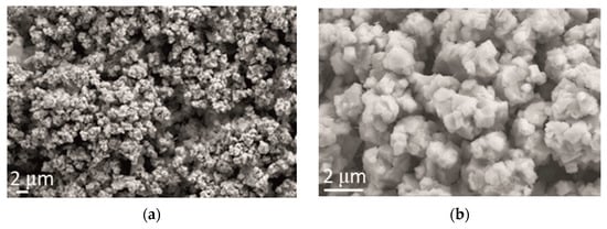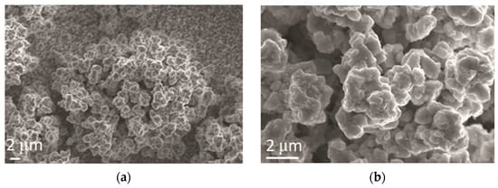 Morphology of Zn-Co alloy obtained by electrodeposition at a current density of 2 A dm−2. Magnification: (a) ×5000 and (b) ×20,000.
