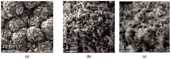 Morphology of Zn-Co-CeO2 coating obtained by electrodeposition at a current density of 2 A dm−2 from the electrolyte with an addition of CeO2 in the form of sol. Magnification: (a) ×5000, (b) ×20,000 and (c) ×50,000.