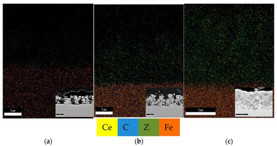 In order to achieve good properties of the final product, the distribution of the particles in the electrodeposited coatings should be homogeneous. The mappings of all elements in the Zn-Co alloy coating and Zn-Co-CeO2 composite coatings are shown in Figure 8. A favorable effect of utilizing ceria sol on ceria distribution could be seen. In addition, based on the cross-section images (inserts in Figure 8), the beneficial effect of ceria sol on compactness and regular growth of the coating was indisputable.