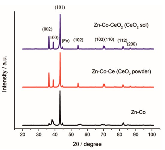 XRD pattern of Zn-Co, Zn-Co-CeO2 (CeO2 powder) and Zn-Co-CeO2 (CeO2 sol) coatings.