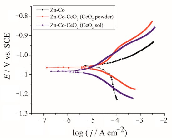 Tafel polarization plots of Zn-Co; Zn-Co-CeO2 (CeO2 powder) and Zn-Co-CeO2 (CeO2 sol) composite coatings.