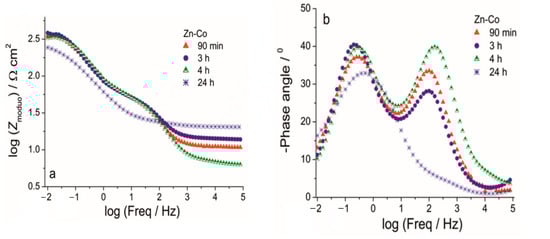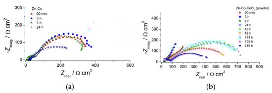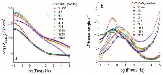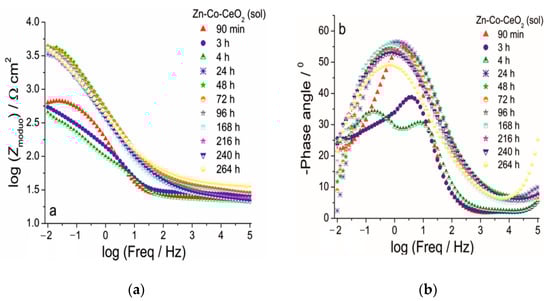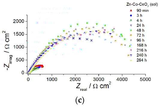 The Nyquist plots for all examined coatings are presented in Figure 11. The plots mainly comprised two time constants in the investigated frequency range. It can be seen from Figure 11a that for Zn-Co coating impedance slightly increased after 3 h while longer immersion times led to a decrease in semicircle diameters, suggesting deterioration of protective properties this coating. The opposite behavior was observed for the composite coatings (Figure 11b,c). The dominant semicircle, related to the charge–transfer process, increased during immersion time, which could be a consequence of the formation of a pseudo-passive layer of corrosion products on the metal surface in contact with electrolyte. However, since this behavior was maintained during prolonged exposure, it indicated the presence of a small solubility product, i.e., ceria layer. This kind of behavior was more pronounced for the composite coating deposited from solution containing ceria sol where the radius of depressed semicircle retained high values during 264h in corrosion media. Differences among the samples and their behavior during immersion time could be better seen from Bode plots, shown in Figure 12, Figure 13 and Figure 14. The impedance modulus of the Zn-Co alloy coating (Figure 12a) decreased after 24h, suggesting a degradation of this coating. Two time constants are clearly visible (Figure 12b) from the early exposure to NaCl solution. The one at medium frequencies may be ascribed to the layer of corrosion products of the Zn-Co alloy coating []. The phase angle maximum at lower frequencies was associated to electrochemical processes occurring at the galvanic couple of Zn-Co alloy coating and steel substrate []. After 24 h there was only a shoulder of the time constant at medium frequencies, due to the breakdown of the corrosion product layer, and the phase angle plot was dominated by the time constant at low frequencies, indicating the advancement of corrosion.