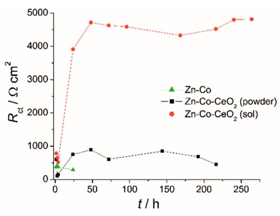 The activity at the metal substrate could be presented by values of charge–transfer resistance, Rct, derived from fitting of the EIS data by commonly used equivalent electrical circuits for coatings comprising one or two time constants [,]. The small initial decrease of Rct for all coatings (Figure 15) was related to contact of the electrolyte with the metal substrate. It was followed with a Rct increase for composite coatings, whereas for the Zn-Co alloy coating Rct values kept decreasing, indicating that a greater area of metal substrate was in contact with the corrosive agent. The plateau of Rct values corresponded to the formation of a passive layer on the metal surface, preventing further electrochemical activity of the substrate. Significantly greater Rct values for sol-derived composite coating compared to the one originating from powdered ceria, confirmed it improved protective properties.