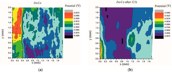 The higher the Volta potential difference (ΔV), the greater the driving force for the localized corrosion, so a larger number of anodic and cathodic sites develop on the surface, resulting in intensive microgalvanic corrosion. The Volta potential distribution on the pure Zn-Co surface (Figure 16) ranged from –0.2970 V to –0.3090 V, i.e., ΔV value for the initial mapping of the Zn-Co coating was 0.012 V, which was a small value and indicated that there were no pronounced microgalvanic couplings on this alloy coating. After 12 h, the Volta potential was in the range of –0.3468 V to –0.3910 V (∆V = 0.0442 V) and after 24 h it considerably increased to ∆V = 0.102 V (between −0.3170 V and –0.4190 V). Thus, the Volta potential difference showed progressively higher values during the monitored period, indicating advancement of corrosion processes. Figure 17 shows that the initial Volta potential distribution for the composite coatings obtained from the plating solution with ceria powder (Zn-Co-CeO2 (CeO2 powder)) was ∆V = 0.0872 V, after 12 h ∆V it changed to 0.0712 V, and after 24 h the ∆V reached 0.122 V. The initial Volta potential difference on the Zn-Co-CeO2 (CeO2 sol) composite coating surface was ∆V = 0.131 V, after 12 h the ∆V value decreased to 0.0582 V, and after 24 h it reached the significantly lower value (∆V = 0.0291 V) as compared to the initial one (Figure 18). It could be noticed that the Volta potential difference of the Zn-Co-CeO2 (CeO2 sol) composite coating was significantly more positive compared to both Zn-Co-CeO2 (CeO2 powder) composite coating and Zn-Co alloy. The Volta potential change was smaller after 24 h than after 12 h, indicating that the Zn-Co-CeO2 (CeO2 sol) coating provided a certain corrosion resistance under the stated conditions. This was most likely due to the higher content of small and well-distributed ceria particles in this composite coating, compared to Zn-Co-CeO2 (CeO2 powder), which can play a role as nanofillers of the pores leading to the reduction of diffusion paths of the electrolyte through the coating. Also, ceria is a well-known corrosion inhibitor, and the shift of the Volta potential to more positive values during this time could be due to precipitation of ceria on the active sites, manifesting a healing effect [,,]. These results were in a good agreement with EIS results.