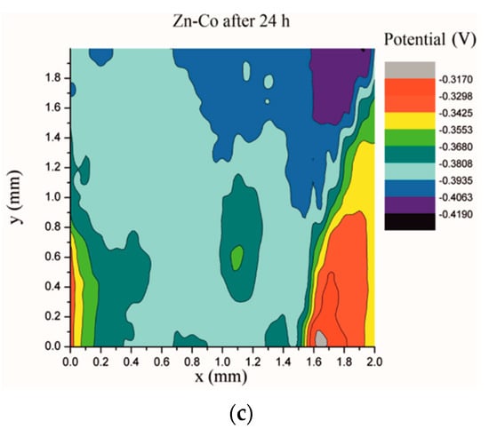 Volta potential difference surface scan of Zn-Co coating: (a) initial distribution, (b) after 12 h and (c) after 24 h in device chamber.