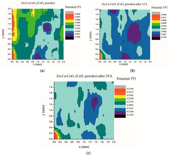 Volta potential surface scan of Zn-Co-CeO2 (CeO2 powder) coating: (a) initial distribution, (b) after 12 h and (c) after 24 h in device chamber.