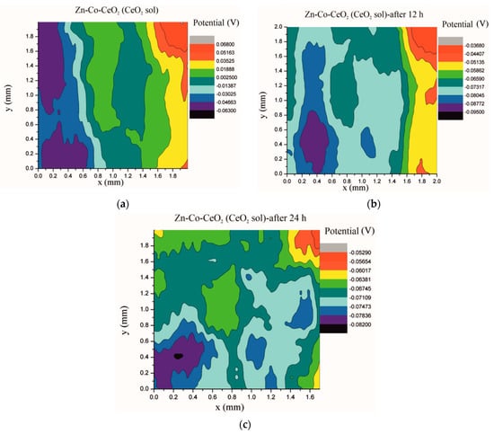 Volta potential surface scan of Zn-Co-CeO2 (CeO2 sol) coating: (a) initial distribution, (b) after 12 h and (c) after 24 h in device chamber.
