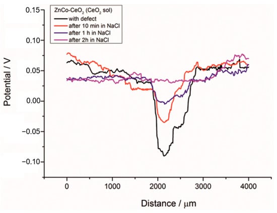To further analyze the self-healing behavior of the Zn-Co-CeO2 (CeO2 sol) composite coating, an artificial defect was made on the surface of this coating, and the SKP method was used to measure the Volta potential over coating and defect area. These localized measurements could be very useful in determining the inhibition ability of different nanoparticles in localized defects []. The Volta potential was monitored before immersion and after different immersion time (10 min, 1 h and 2 h) in a chloride-rich environment (3 wt.% NaCl). From the SKP line scan before immersion in NaCl (black line), shown in Figure 19, a drop of the Volta potential can be seen when the tip is placed over defect area. The ∆V value in this case was 0.146 V, indicating the high corrosion driving force. After 10 min (red line) in NaCl the Volta potential in the defect decreased to ∆V = 0.054 V and shifted toward positive values, suggesting the suppression of corrosion propagation in artificial defect. After 1 h (blue line) in corrosion media the ∆V value was lower, 0.046 V, and after 2 h was reduced to 0.039 V (pink line). After 2 h the Volta potential in the defect reached the potential of the surrounding undamaged coating. This result proved the self-healing ability of the ceria particles present in the composite coatings. We assume that different scenarios are possible. The ceria particles migrated and precipitated on the active corrosion sites at the defect. In addition, reduction of CeO2 to Ce2O3 occurred in the corrosion media, so that Ce2O3 as a soluble compound could release the Ce3+ ions into the solution [] providing a self-healing action. The Raman study performed in our previous work showed that Ce3+ ions are present in synthesized ceria sol nanosized particles []. Due to diffusion the Ce3+ ions reached the defect area and formed thermodynamically favorable cerium-hydroxide (Ce(OH)4) and oxide (CeO2·2H2O) []. The reduction of oxygen generated OH– ions on the defect surface, increasing the local pH and, according to the Pourbaix diagram, accelerated the formation of Ce(OH)4 and CeO2·2H2O []. The ceria precipitations along with other corrosion products in the coating defect, i.e., corroding sites, could reconstruct the protective film during time, consequently, slowing down the advancement of corrosion. The percentage of the self-healing rate (%SHtime) after a different immersion time in NaCl can be calculated based on the ∆V value in the defect according to equation: