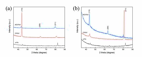 XRD results of (a) pristine α-Fe, CrFeV, and AlCrFeV and (b) irradiated samples.