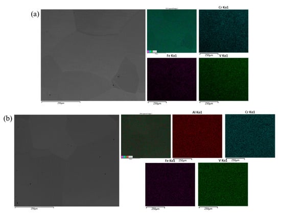 SEM back-scattered images and EDS-mapping of (a) CrFeV, and (b) AlCrFeV.