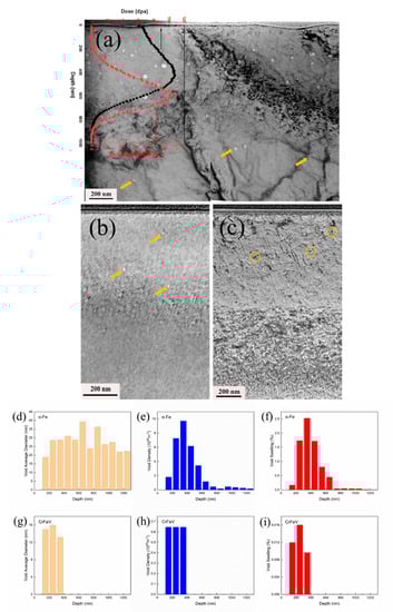 Figure 3 displays the bright field (BF) TEM images of three FIB specimens and the void statistic results for α-Fe and CrFeV. The curve graph shown in Figure 3a displays the damage and implanted ion profiles in α-Fe, which were calculated with SRIM 2008 [] based on the quick Kinchin–Pease option. The peak dose in α-Fe is about 108 dpa, and the dose rate was about 4.5 × 10−3 dpa/s. In our statistics, at least 300 clearly visible voids in the whole FIB specimen spanning across ~10 μm were measured in the α-Fe FIB specimen, and all visible voids were counted in the CrFeV FIB specimen spanning across ~6 μm. No voids were observed in the AlCrFeV FIB specimen, indicating the alloy’s strongest irradiation swelling resistance among the three samples. Figure 3d–f show the statistical results of void average diameter, void density, and void swelling at various depths in α-Fe, respectively, and Figure 3g–i show the same for CrFeV. As we can see, voids were distributed in a wide range (100–1300 nm) in α-Fe, and some voids were located far beyond the Au ions range, which means some vacancies move outside the range and then agglomerate to form voids. Although the average size of voids does not significantly change at different depths, the large voids mainly occurred at 200–600 nm, resulting in large void swelling in this range. In CrFeV, voids were distributed in a narrow range (100–400 nm) which implies the vacancy migration, and agglomeration was more local in CrFeV compared to α-Fe. Considering the maximum void swelling region, the swelling in α-Fe (200–600 nm) is ~1.70%, which is more than 100 times the swelling of ~0.013% in CrFeV (100–400 nm). For these two samples, there were no voids in the region near the surface (0–100 nm) because the surface is a huge sink for point defects. As for AlCrFeV, no voids were observed in the specimen. Here, clear experimental results show that the multi-component alloys have significantly improved void swelling resistance compared to pure reference metal, and the Al element in AlCrFeV has a significant effect on void swelling control.