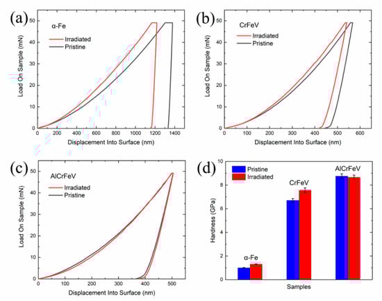 Representative load–unload curves of: (a) irradiated and pristine α-Fe; (b) CrFeV; and (c) AlCrFeV. (d) Comparison of hardness.