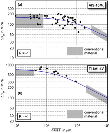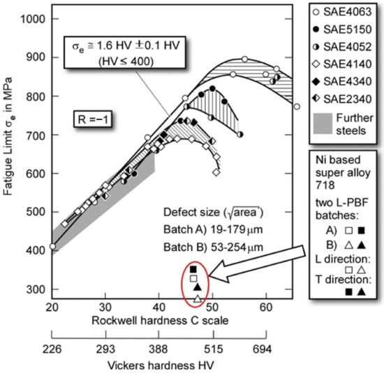 In the context of a similar study, Murakami et al. [] concluded that the relation  (resulting values in MPa) of the straight line in Figure 1 up to  400 is applicable to additive manufacturing only in combination with hot isostatic pressing (HIP) and surface polishing. The consequence is that, in the general case, defects have always to be taken into account for L-PBF materials.