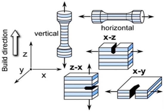 For L-PBF parts, further aspects have to be considered. The most important one is the pronounced dependence of the properties on the build direction. Figure 2 provides the nomenclature for specimen directions. Note that the poorest mechanical properties are usually obtained for vertical (z) and z–x directions. The relation of the building direction with the loading direction strongly affects damage. In a component of more complex geometry, the situation is not as simple as shown in Figure 2 since the principal stress directions change from site to site.