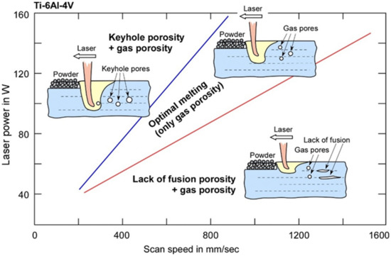 Figure 3 provides an overview on the formation of the different defect types discussed so far depending on the laser power and the scan speed on the example of L-PBF manufactured Ti–6AL–4V (see [,,]).