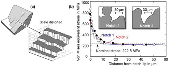 In the as-built condition, L-PBF parts show a much larger surface roughness than conventional parts. There are different reasons for this: one is partially melted powder at the surface due to an unstable melt pool; another is stepwise layer building, which forms “staircases”, especially in overhanging structures [] (Figure 4a). Yadollahi and Shamsaei [], investigating a cylinder of L-PBF Inconel 718 generated in 45° direction measured a roughness of  ~0 μm at the upward- and  ~5 μm at the downward-facing surface. Relevant for fatigue, such roughness is in the order of the critical defect size discussed in Section 1.1. In Figure 4b, the notch effect of surface roughness is illustrated for L-PBF Ti–6Al–4V []. A roughness profile, such as the one shown in Figure 4, is not easy to measure by conventional methods because it includes undercuts (or re-entrant features). As can be seen, the stress concentration is about  or even larger. This number is in line with what is otherwise known for L-PBF [].