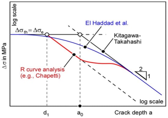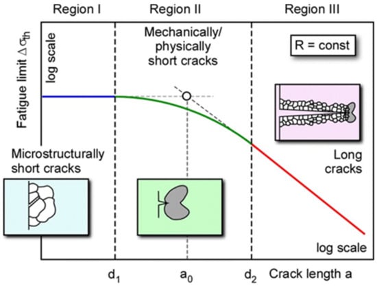 A traditional approach is the semi-empirical Kitagawa–Takahashi diagram (hereinafter KT diagram) []. The threshold cyclic stress is plotted against the crack or defect size in double-logarithmic scale, Figure 5. The diagram consists of three distinct regions. In region I, the threshold stress level  is defined by the plain endurance limit . Such region ends at a crack/defect size  that corresponds to the critical crack size mentioned in Section 1.1 (a), at which even the largest of the microcracks arrests. Region III describes the long fatigue crack propagation regime, where crack arrest occurs when the stress intensity factor range   falls below the fatigue crack propagation threshold . A long crack is a crack with saturated crack closure phenomenon, i.e., the crack closure is independent of the crack depth and the crack is long enough (down to a length d2) such that the stress intensity factor concept can be applied (small-scale yielding condition). Its slope in the KT diagram is −1/2. Region II, between  and , belongs to the mechanically/physically short crack regime where both conditions are not fulfilled. The cyclic crack driving force has to be determined accounting for elastic-plastic conditions, and the crack closure phenomenon builds up gradually.