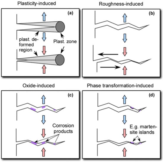 Crack closure mechanisms: (a) plasticity-induced; (b) roughness-induced; (c) oxide-induced; (d) phase transformation-induced.