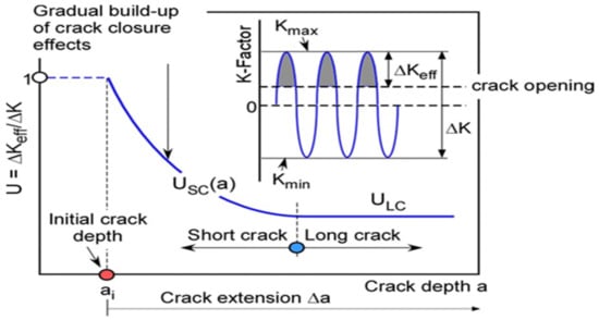 A common parameter for the characterization of crack closure is the closure parameter  with the effective cyclic stress intensity factor  being the part of  over which the crack is open. At the stage of the physically short crack growth, the closure effect does not initially exist because it presupposes a certain extension of the crack wake, i.e., . It then gradually builds up and  decreases with crack extension  until it reaches a crack size independent value when the crack enters the stage of long crack growth; these mechanisms are explained in Figure 7.