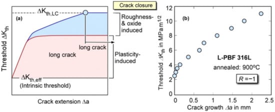 While  is a material parameter that only depends on the elastic constants of the material and its lattice type [],  is characteristic for the material, e.g., its grain size (via the roughness-induced closure effect), the stress ratio , and for physically short cracks, the crack extension . The intrinsic threshold is in the order of 2.4–2.6 MPa m1/2 for steels, 0.9–1.9 MPa m1/2 for aluminum alloys, and 1.7–2.5 MPa m1/2 for titanium alloys [].