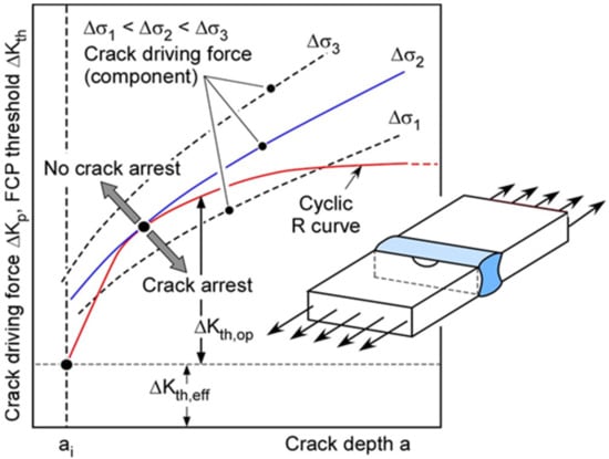 The principle of a cyclic R curve analysis is illustrated in Figure 10. Cyclic crack driving force curves of the component are plotted as functions of the crack depth () for three stress levels  to . As mentioned above, an elastic-plastic parameter has to be used as crack driving force. This is indicated by the index “p” in , which is a plasticity-corrected  formally derived from the -integral [,]. The cyclic R curve is also plotted in Figure 10. Its origin is given by the intrinsic threshold, , on the ordinate and by an initial crack depth  on the abscissa.