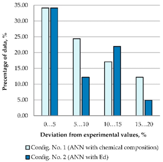 To further evaluate predictive accuracy of artificial neural networks for prediction of total hardness after continuous cooling, HVtot, deviations of predicted values from their experimentally obtained counterparts were used as relevant indicators. Deviations up to ±5, ±(5…10), ±(10…15) and ±(15…20)% were used for evaluation of predictions of HVtot and shown in Figure 5 for “unseen” dataset.