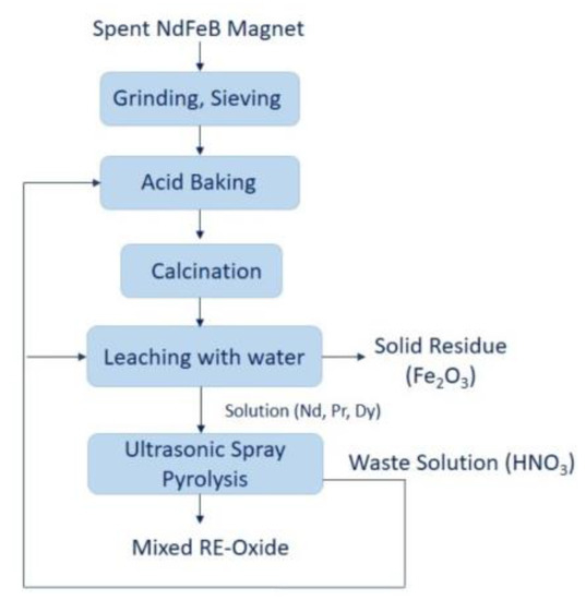 In the final step of ultrasonic spray pyrolysis, the produced nitric acid shall be recycled and sent to the acid baking process. This study aims at investigating the conditions required to produce mixed REE-oxides in the combined hydrometallurgical process (acid baking with water dissolution and ultrasonic spray pyrolysis process). A literature review reveals that this information is currently not reported for the production of mixed RE-oxide using leach liquor. The proposed route promotes the enhancement of the circular economy of critical raw materials/REEs and could provide a high potential to increase resource efficiency for spent NdFeB magnets.