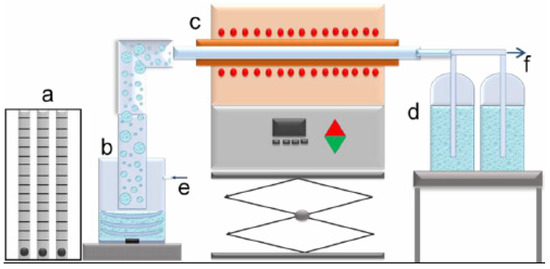 One step ultrasonic spray pyrolysis lab-scale horizontal equipment: (a)—gas flow regulation; (b)—ultrasonic aerosol generator; (c)—furnace with the wall heated reactor; (d)—collection bottles; e—gas inlet, f—gas outlet.