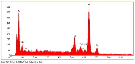 As shown at Figure 5, Energy Dispersive Spectroscopy (EDS) results demonstrate that NdFeB magnet powders primarily consist of Fe and Nd. EDS results are in good agreement with the ICP analysis results but due to the small amount of the other elements, they cannot be detected by EDS.
