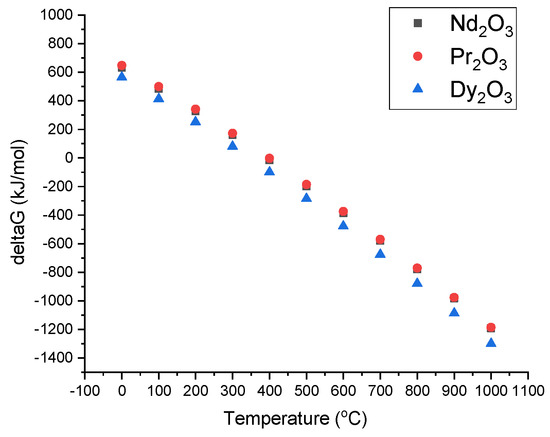 The Gibbs free energy for the temperature range of 0–1000 °C is exhibited in Figure 6. As can be seen, the Gibbs free energy is negative after 500 °C. This allows for RE-oxide to be formed by the thermal decomposition of leach liquor, which is energetically favored after 500 °C.