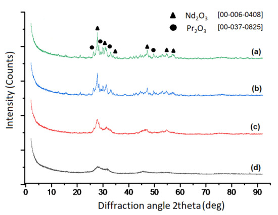 XRD analysis of powders obtained between 700 °C and 1000 °C confirmed the formation of a mixture of RE-oxides. The cubic structure of Nd2O3 with 20% of Pr2O3 was found between 700 °C and 800 °C as shown at Figure 7. Checks of the XRD Pattern for crystal structure leads to Nd1.6Pr0.4O3 solid solution. An increase in temperature from 800 °C to 900 °C and 1000 °C leads to a mixture of cubic and trigonal structure of Nd2O3 with 20% of Pr2O3, as shown at Figure 7. An increase in temperature from 700 °C to 1000 °C increases the crystallinity of the obtained structure. Additionally, typical EDX-Analysis of powders was shown at Figure 8, confirming the presence of rare earth elements.