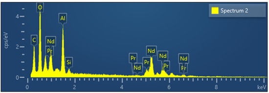 Therefore, recycling has considerable advantages over processing natural ores and concentrates on account of energy effectiveness and selectivity [12]. Neodymium iron boron magnets (NdFeB) are the most valuable REE secondary resource because they contain a high content (approximately 20%) of REEs, neodymium (Nd), dysprosium (Dy) and some REEs in minor quantities, such as praseodymium (Pr). Between 20 and 25% of REEs produced worldwide are used in the production of NdFeB. Increasing future production of hard disks, automotive applications, motors, speakers, air conditioners, electronic devices, electric bicycles and wind turbines provides a strong driving force for finding a new process for recycling spent NdFeB magnets [13,14,15]. Furthermore, an alternative product that can replace NdFeB magnets in today’s technologies in terms of performance and cost has not been developed yet. Therefore, the recycling of spent NdFeB magnets is the most promising effective alternative for the solution of the supply problem of Nd, Dy and Pr.