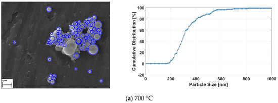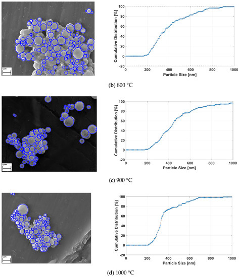 Applied image processing methods generate the black and white images from the original SEM images for determining the location and size of the RE-oxide nanoparticles. Since the particles are known to have spherical shapes [33], the Hough transform method was utilized for approximately defining the nanoparticles. The Hough transform draws new circles at the three boundary points. Then, the center of the circle is computed, with the junction point of new circles and diameter limits defined by the user. After the detecting RE-oxide nanoparticles, these particles were labelled with blue rough circles and their cumulative distribution results related to process conditions were achieved. The results are given in Figure 10.