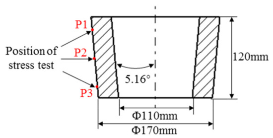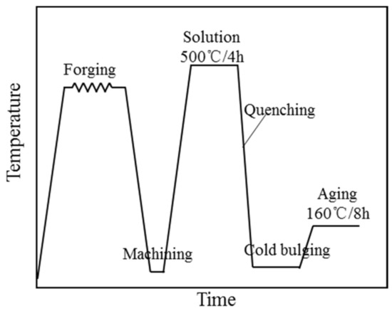 Heat-treatable 2xxx high-strength deformed aluminum alloys are widely used in the aerospace industry due to their low weight [19,20]. For example, large 2A14 tapered cylinder forgings are often used to process large thin-walled load-bearing components. The solution and quenching treatments are crucial processes which endow the tapered cylindrical forgings with high mechanical properties; however, they significantly contribute to the generation of quenching residual stress. Owing to the size and asymmetric structure of the tapered cylinder forgings, the reduction in residual stress by applying conventional compression and stretching cold deformation techniques is not feasible. To compensate for the challenging structural characteristics of tapered cylinder forgings, a novel cold bulging process is required to achieve residual stress relief. Compressing along the taper of the cylinder forging to attain uniform plastic deformation could provide a viable approach to the above objective.