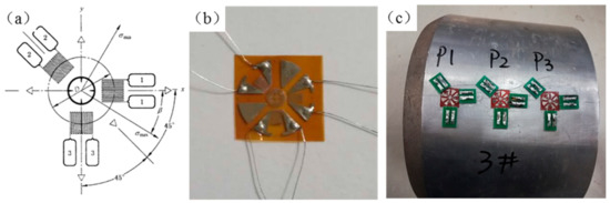 The residual stresses of the samples were measured using the hole drilling strain-gauge method, in accordance with the GB/T 31310-2014 standard. As shown in Figure 4, TJ120-1.5-Ø1.5 type A strain-gauge rosettes were attached to the test points following the procedure provided by the Zheng Zhou Research Institute of Mechanical Engineering Co. Ltd., Zhengzhou, China. During the residual stress measurements, 2 mm deep holes were drilled at the test points using a HK21B type drilling device. For all residual stress measurements, the center of the drill hole and strain rosette were at the same position.