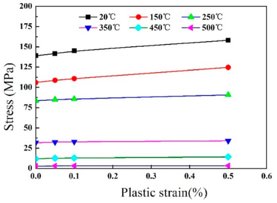 Yield strengths at different temperatures and plastic strains.