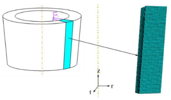 The size of the FEM simulation model was the same as that of the reduced-scale tapered cylinder forging samples used in the experiments (Figure 1). Due to the axisymmetric geometry and boundary conditions of the tapered cylinder forgings, only 1/24 of the sample was used to establish a simplified model for the quenching and cold bulging processes (Figure 6), significantly reducing the simulation calculation time. For the quenching process simulation, 3-dimensional, 8-node linear heat transfer (C3D8T) elements were used. Accordingly, 3-dimensional, 8-node trilinear displacement and temperature, reduced integration, hourglass control (C3D8RT) elements were used for the cold bulging process simulation. The total elements of each simulation model were 9600. The quenching and cold bulging process boundary conditions were consistent with those reported in the experiments discussed above (Figure 2 and Figure 3). The quenching residual stress field was applied as the initial condition in the subsequent cold bulging process simulation, where the effect of the cold bulging ratio on the residual stress reduction performance was also investigated. The cold bulging ratios of 0, 1, 2, 3, and 4% were simulated. The pressure velocity of the bulging die mold was 5 mm/s for all cold bulging simulation scenarios.