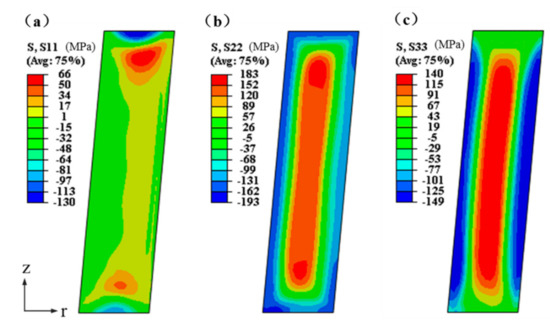Residual stresses nephogram of the 2A14 tapered cylinder forging in the r-, t-, and z-directions after quenching: (a) σr; (b) σt; and (c) σz.