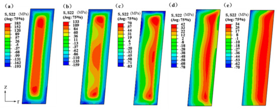 Residual stresses nephogram of the 2A14 tapered cylinder forging in the t-direction under different cold bulging ratio conditions: (a) 0%; (b) 1.0%; (c) 2.0%; (d) 3.0%; and (e) 4.0%.