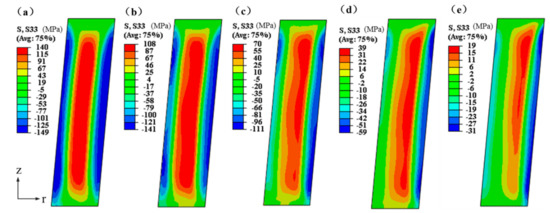 Residual stresses nephogram of the 2A14 tapered cylinder forging in the z-direction under different cold bulging ratio conditions: (a) 0%; (b) 1.0%; (c) 2.0%; (d) 3.0%; and (e) 4.0%.