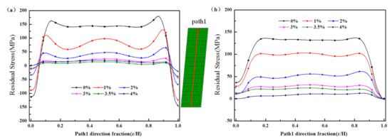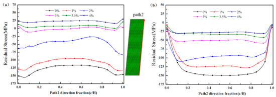 When an object sustains non-uniform plastic deformation due to inhomogeneous temperature distribution, quenching residual stress is manifested. Relatively large tensile and compressive stresses can be observed at the core and surface of the quenched forgings, respectively. Residual stress is a stress system that exists in a body without external forces. Assuming a uniform plastic strain acted on the material during the cold deformation process. Cold deformation causes plastic deformation with the opposite sign of the residual stress, thus relieving the material from the residual stress. When the external load is eliminated, the internal stress is rebalanced, and the overall residual stress level of the object is reduced [23]. It was suggested that the quenching residual stress was effectively reduced after the material underwent plastic deformation, but it was not completely released. As shown in Figure 13, under 2–3% of cold bulging, the quenching residual stress of the tapered cylinder forgings was effectively reduced by approximately 85%, which was in good agreement with the results of the FEM simulation.