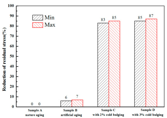 The residual stress values of samples C (2% cold bulging) and D (3% cold bulging) were approximately 19 MPa and 16 MPa, respectively. Their quenching residual stress reduction percentages were compared to that of the sample with natural aging (Figure 13). The results indicated that the quenching residual stress of the cylinder forgings with 2% cold bulging decreased by 95–110 MPa. When the cold bulging rate was increased to 3%, the increase in the reduction percentage was marginal.